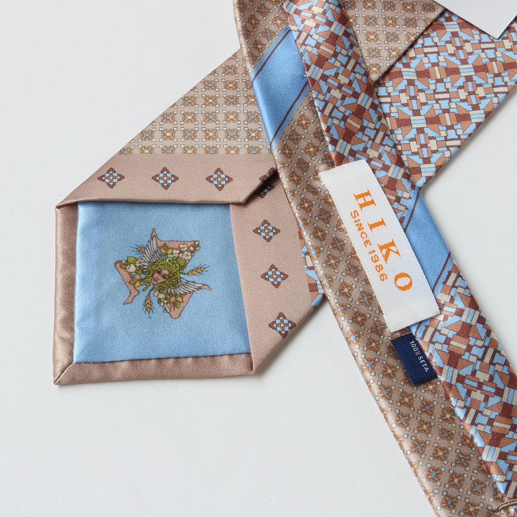 幾何学と小紋を巧みに組み合わせた、創業者の美意識が色濃く反映された一本。本品は創業者シルヴィオ氏が特に推奨するスペシャルコレクションです。大剣の裏には同コレクショのみに使用されるシチリアのシンボル、トリナクリアがデザインされています。