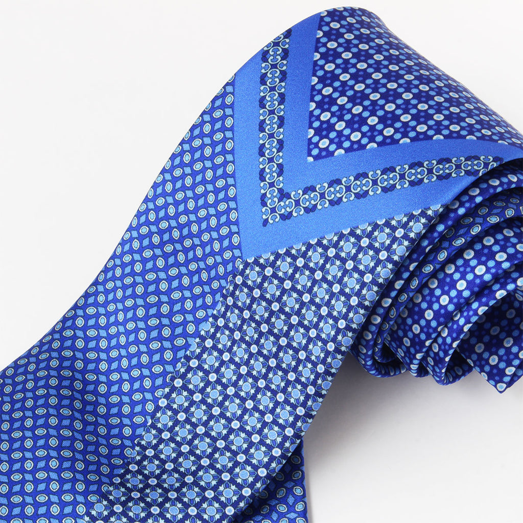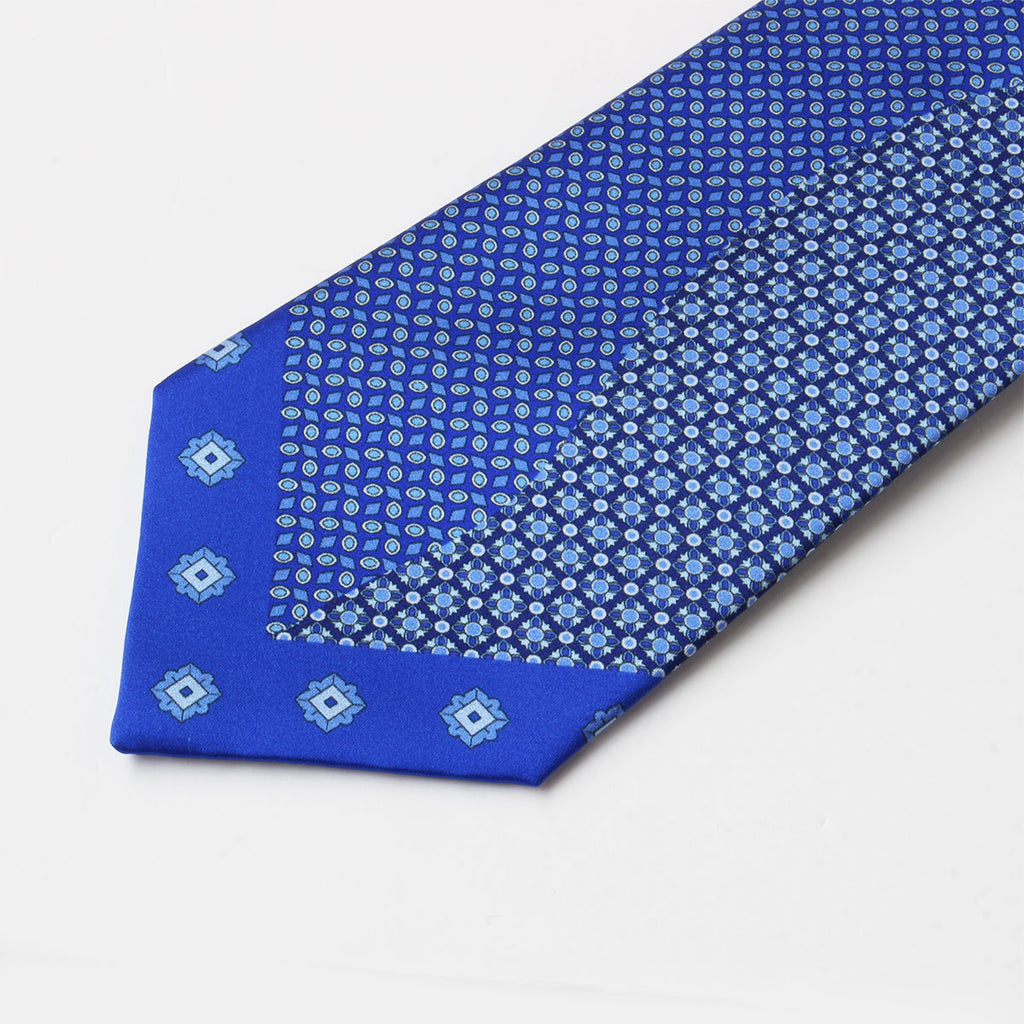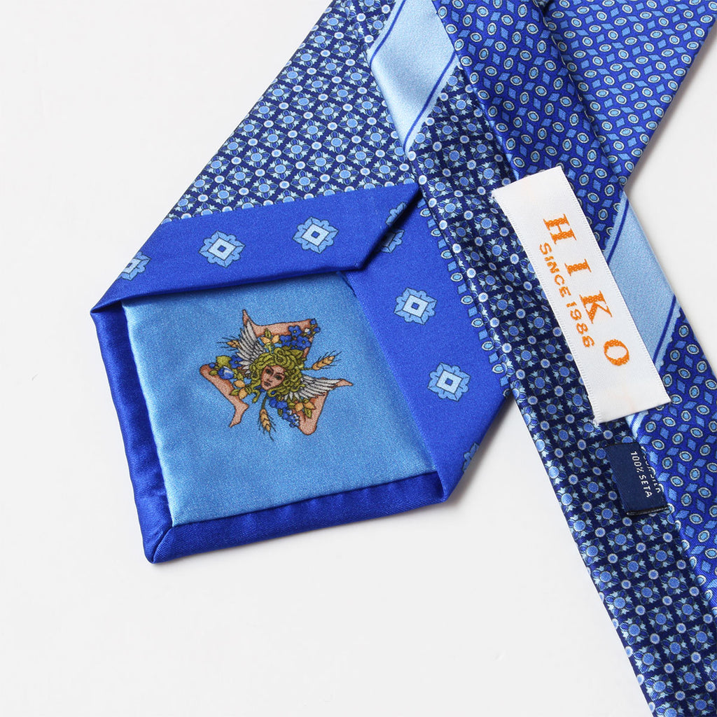 複数のブルーを組み合わせたパネル構成が印象的な、特別感のあるプリントデザイン。本品は創業者シルヴィオ氏が特に推奨するスペシャルコレクションです。大剣の裏には同コレクションのみに使用されるシチリアのシンボル、トリナクリアがデザインされています。