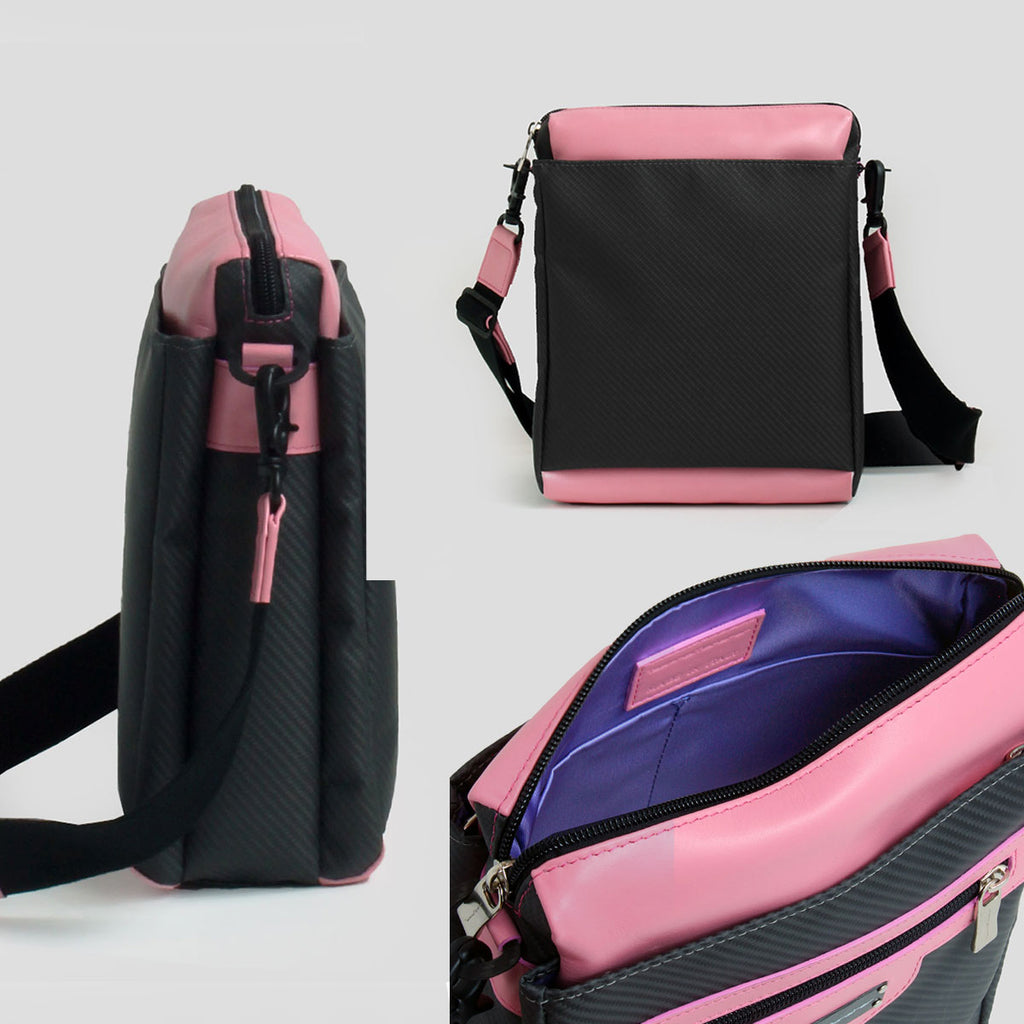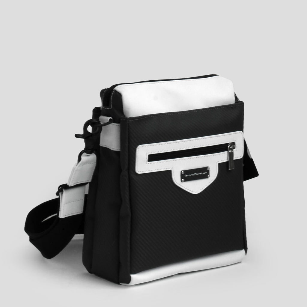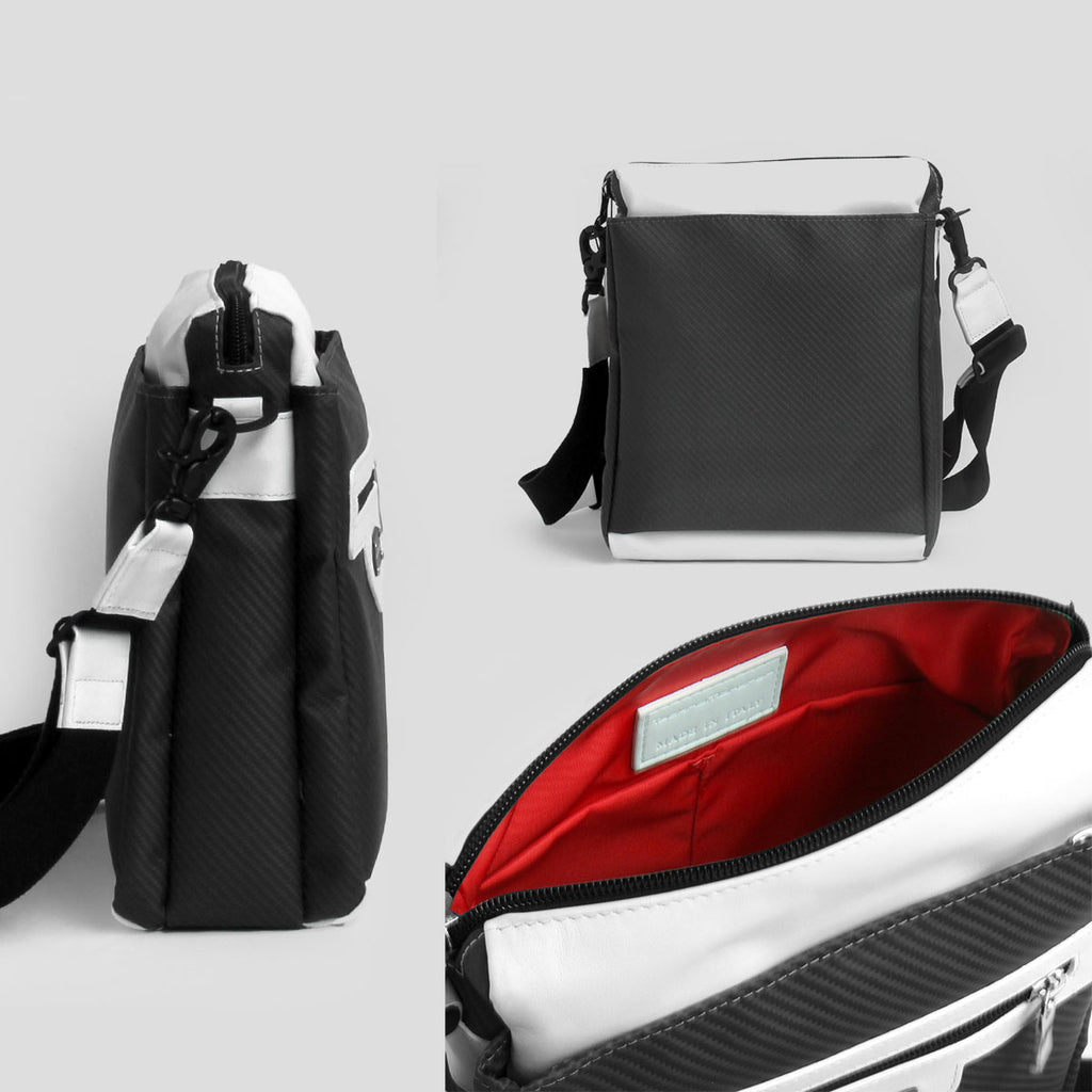 ボディ全体にカーボンファイバーを採用した、軽量かつ高耐久なショルダーバッグ。 洗練されたカーボンの光沢が、日常に上質なアクセントを添えます。 複数のポケットと仕切りを備え、コンパクトなサイズ感ながら収納力は抜群。 スマートフォンや財布、鍵などの小物類が整理しやすく、デイリーユースに最適です。 内装にはイタリア「リモンタ社」の鮮やかなブルーナイロンを使用し、荷物の視認性にも配慮。 機能性とデザイン性を高次元で融合した、ハイスペックな一品です。