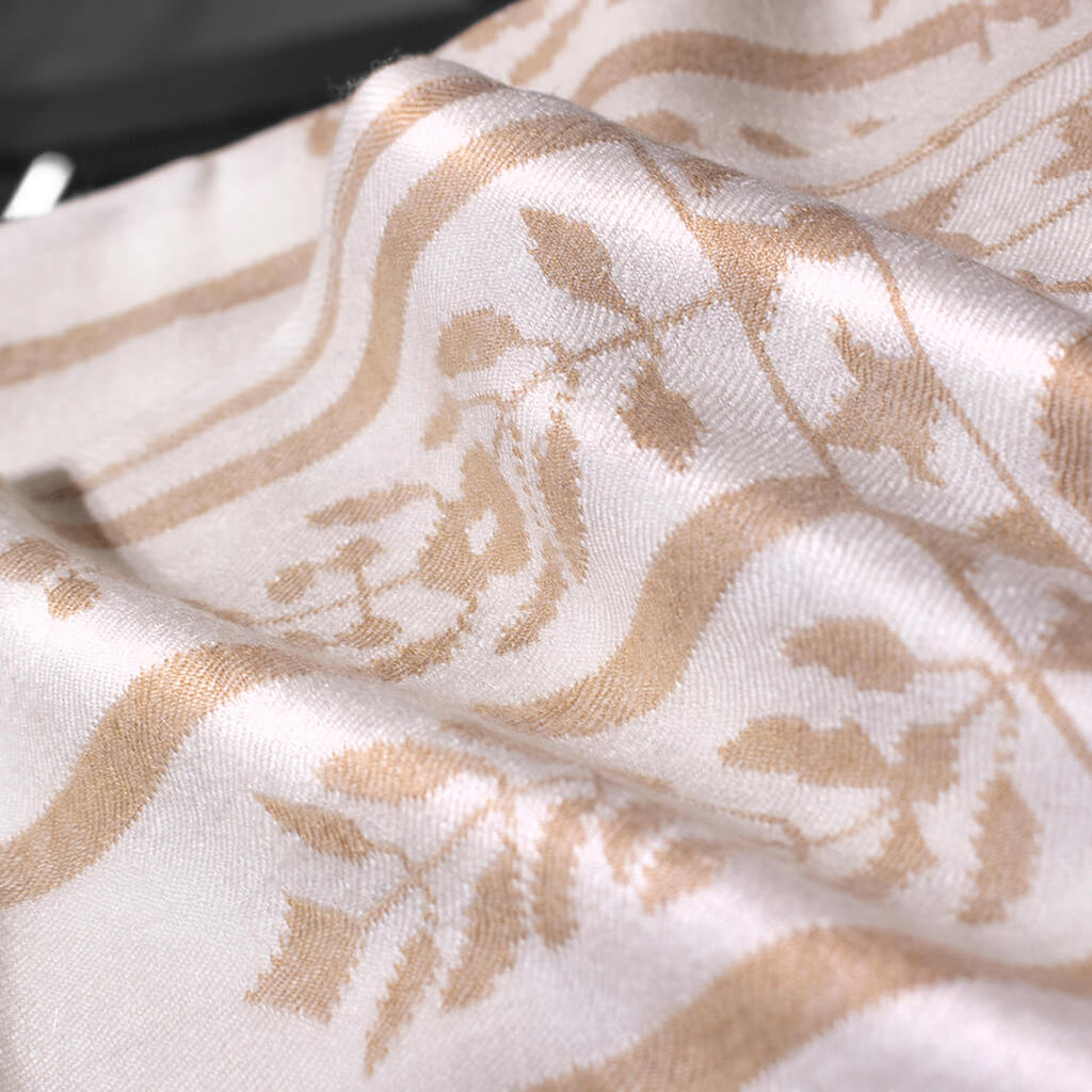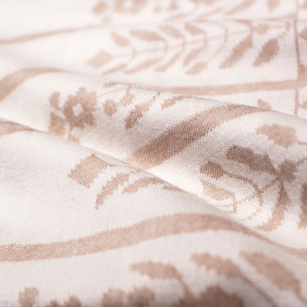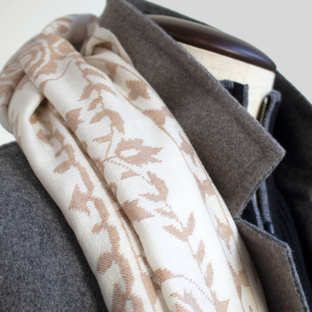 際立つ希少性の高さと美しさ、極上の肌触りから「神の繊維」と呼ばれる獣毛繊維ヴィキューナ(ビクーニャ)。そのヴィキューナ100%の糸とベビーカシミヤ100%の糸で柄を織りなした(組成表示でヴィキューナ33%ベビーカシミヤ67%となっておりますのは、一枚のストールの中に占める比率を表しております。)大判ストールでございます。明るいアイボリー色の部分がカシミヤ、少し濃いめのベージュの部分がヴィキューナです。