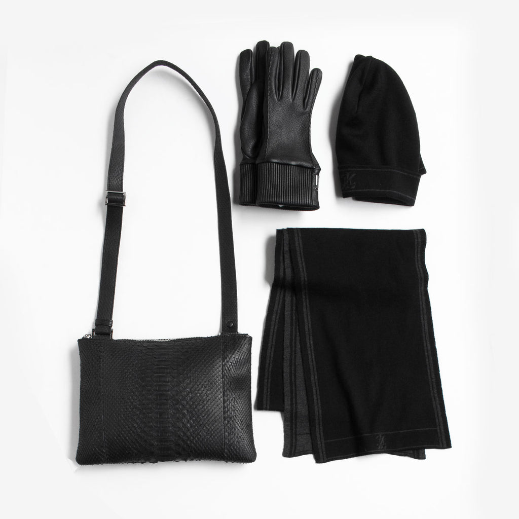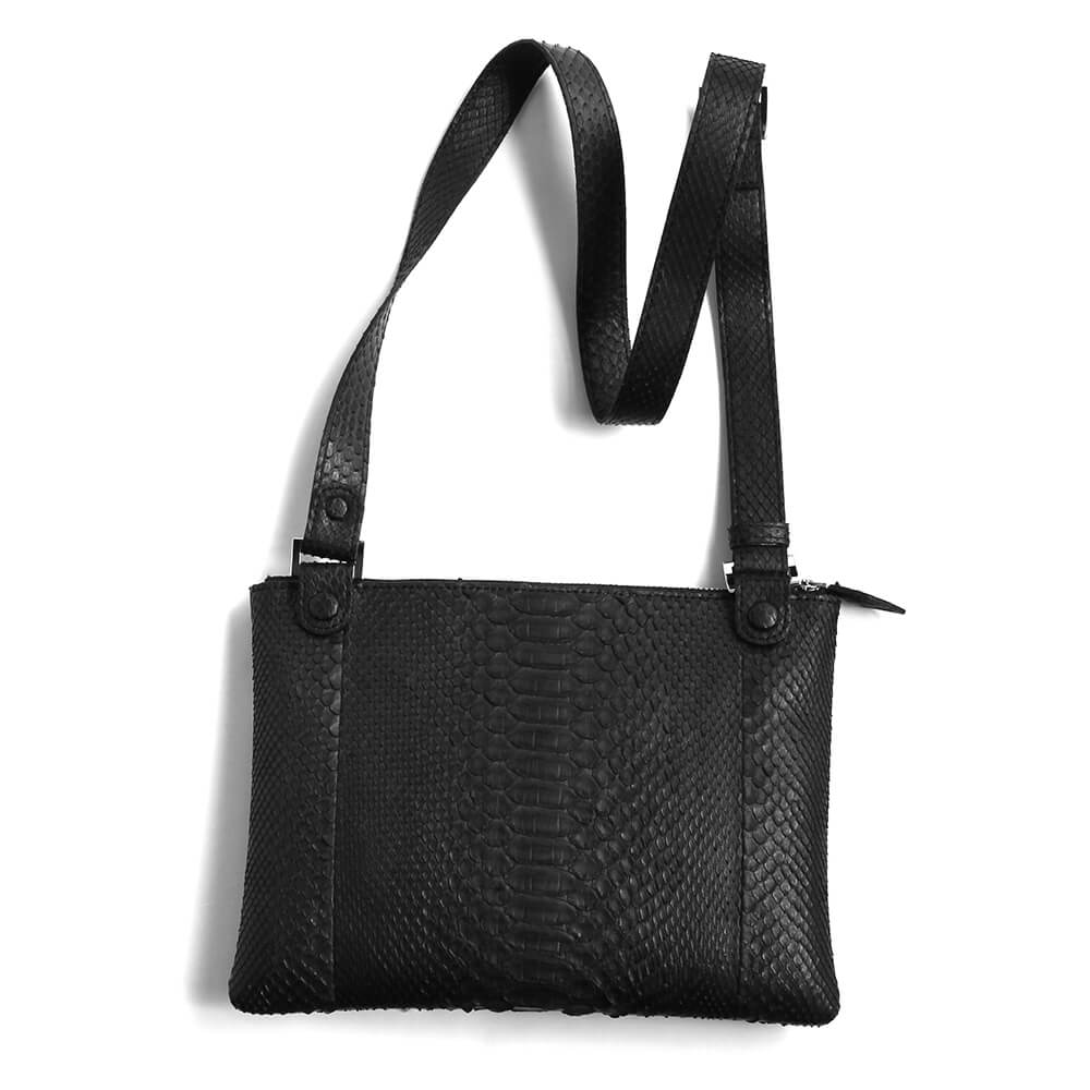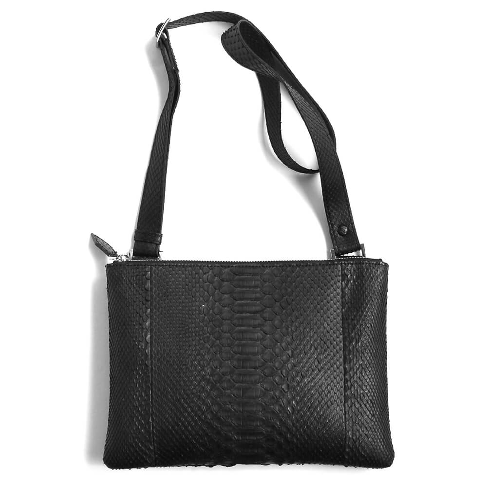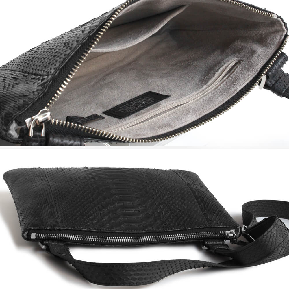 性別を問わず使えるシンプルなデザインで日常の必需品を収める、洗練されたサイズ感が魅力です。ショルダーストラップには同素材のパイソンレザーを使用しており、取り外せばクラッチバッグやバッグインバッグとしてもお使いいただけます。