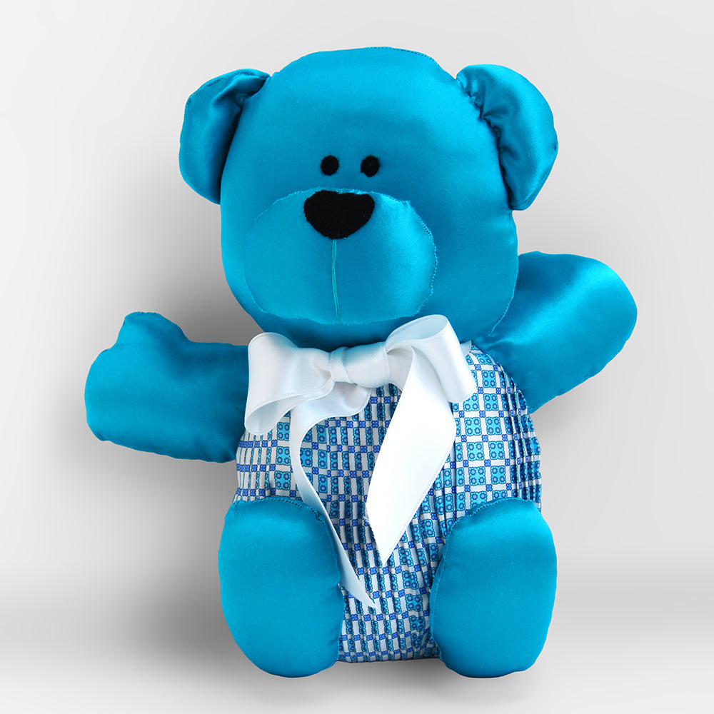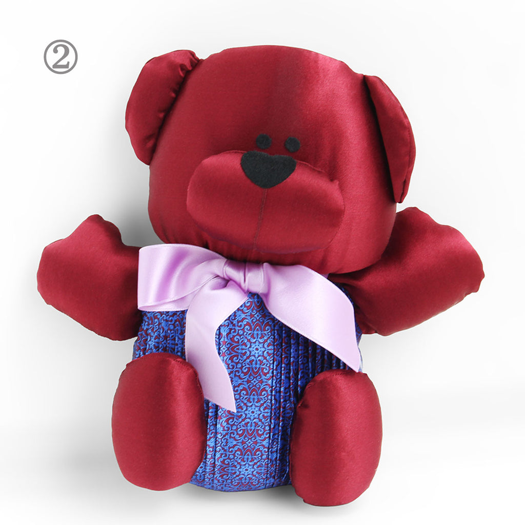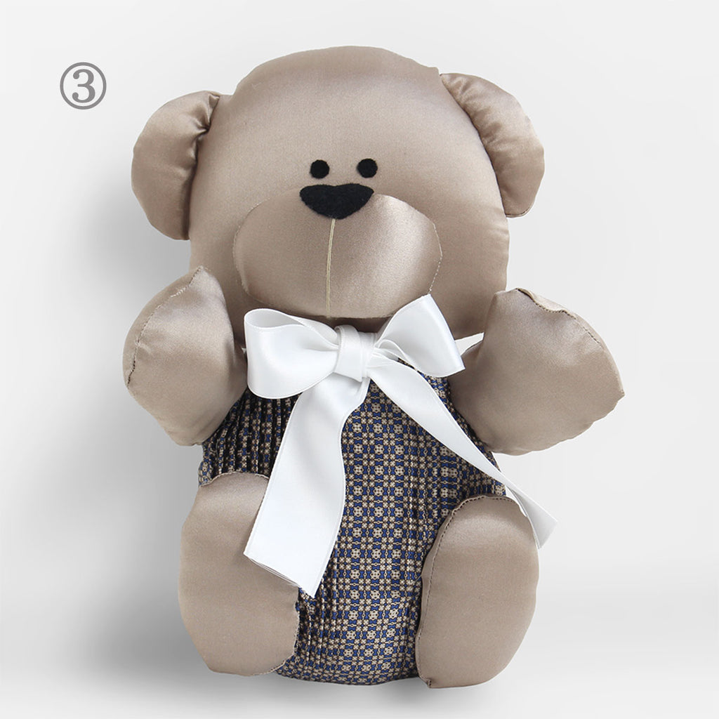 上質なシルクで仕立てられた、特別なクマのぬいぐるみ。 ボディ部分にはネクタイと同じ生地を使用しております。
