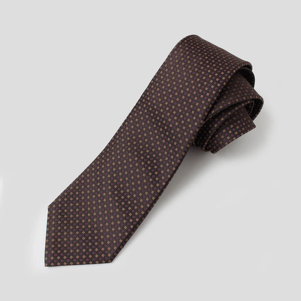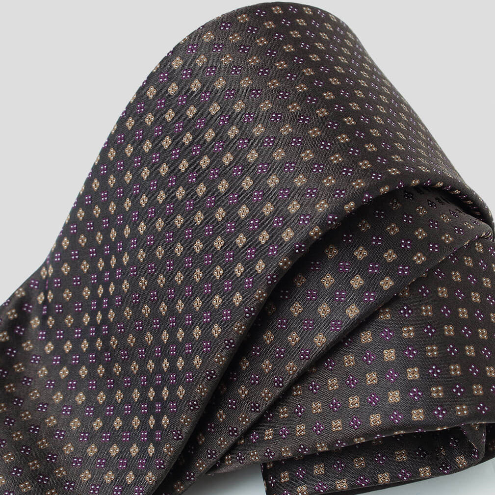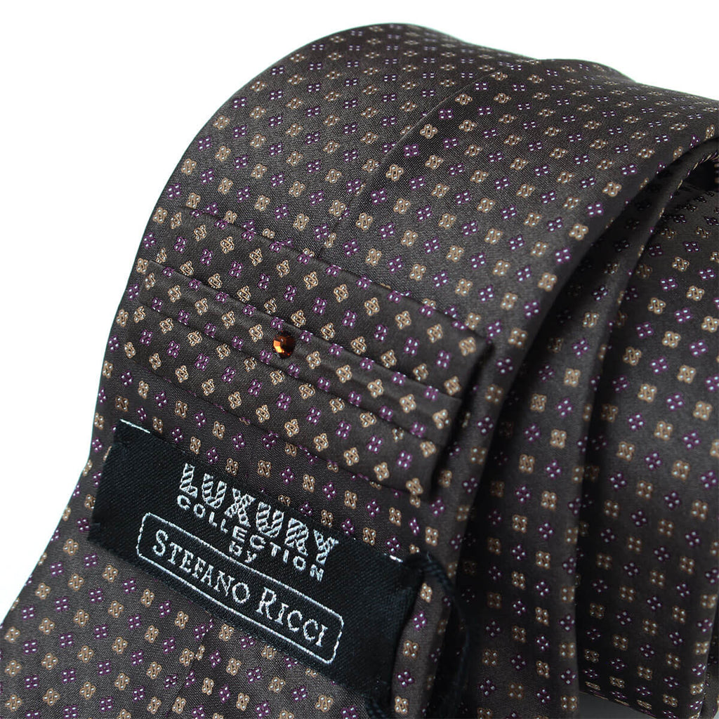 深みのあるダークブラウンをベースに、パープルとゴールドの小紋が規則正しく配されたシルクジャカードネクタイ。。こちらはステファノリッチ本社のアーカイブとして、長年大切に保管されてきた貴重なジャカード生地を用いた特別な一本。