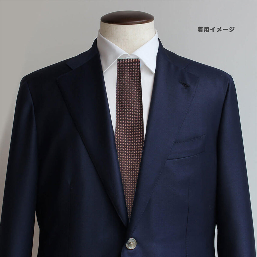 光の当たり方によって柄の立体感が浮かび上がり、落ち着いた装いに知的な艶を添えます。主張しすぎない存在感は、スーツスタイルを格上げしたい場面に最適です。