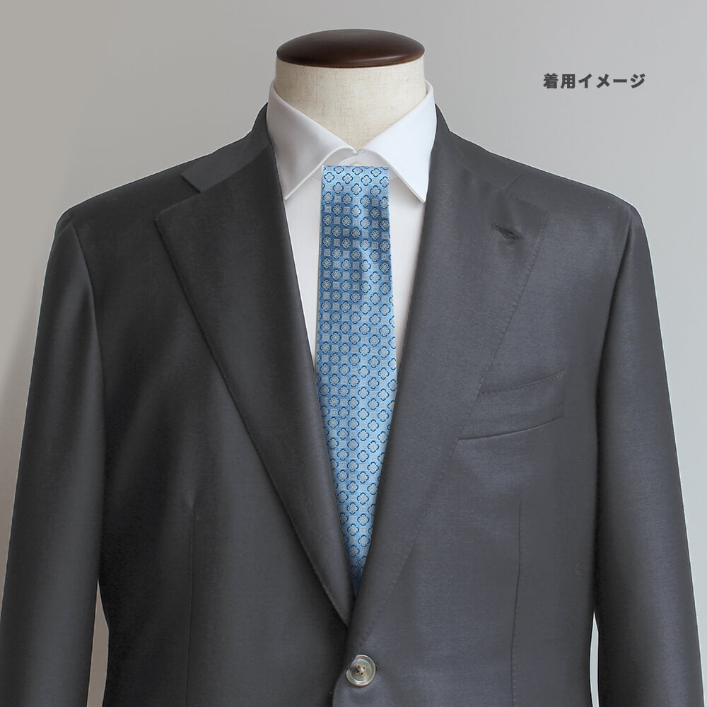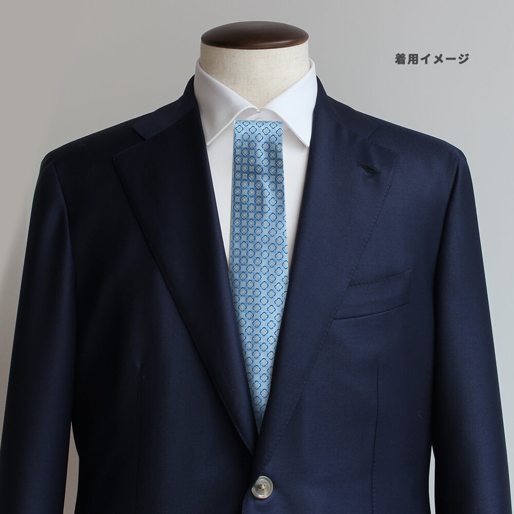 光沢感のあるライトブルーに、立体的な小紋柄をジャカード織で表現した一本。明るい印象ながら品格を感じさせるデザインです。