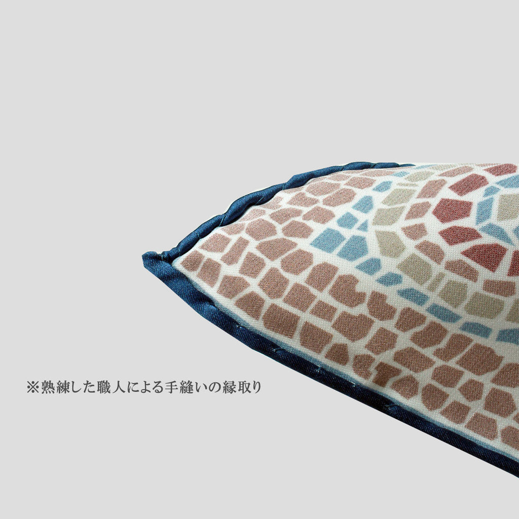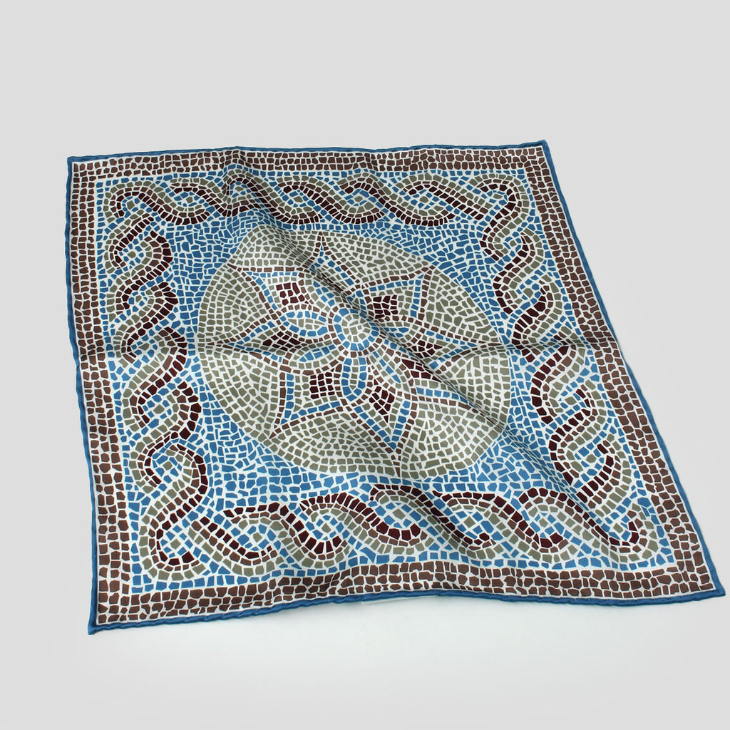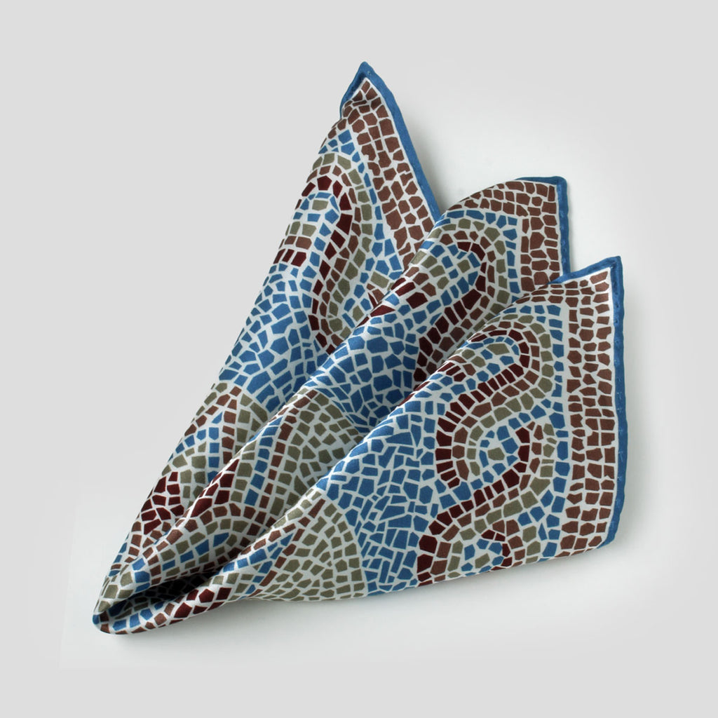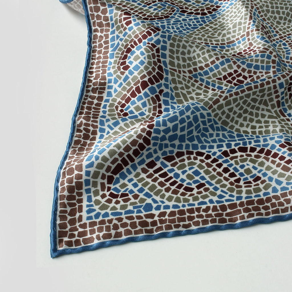シチリアのモザイク装飾を思わせる幾何学柄が、地中海の空気感を演出する一枚。ポケットチーフは、折り方によっていくつかの柄が見えるようになっていて、さりげなく個性を引き立ててくれます。 どちらも、いつものコーディネートにちょっとした変化を加えたいときにぴったりのアイテムです。