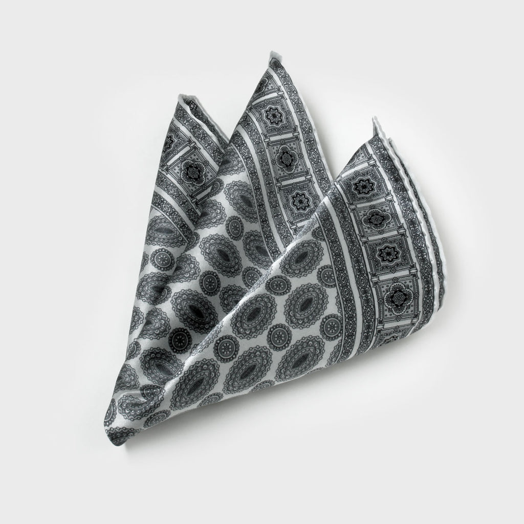 クラシックな小紋柄をシチリア流に昇華した、都会的で洗練された一枚。ポケットチーフは、折り方によっていくつかの柄が見えるようになっていて、さりげなく個性を引き立ててくれます。