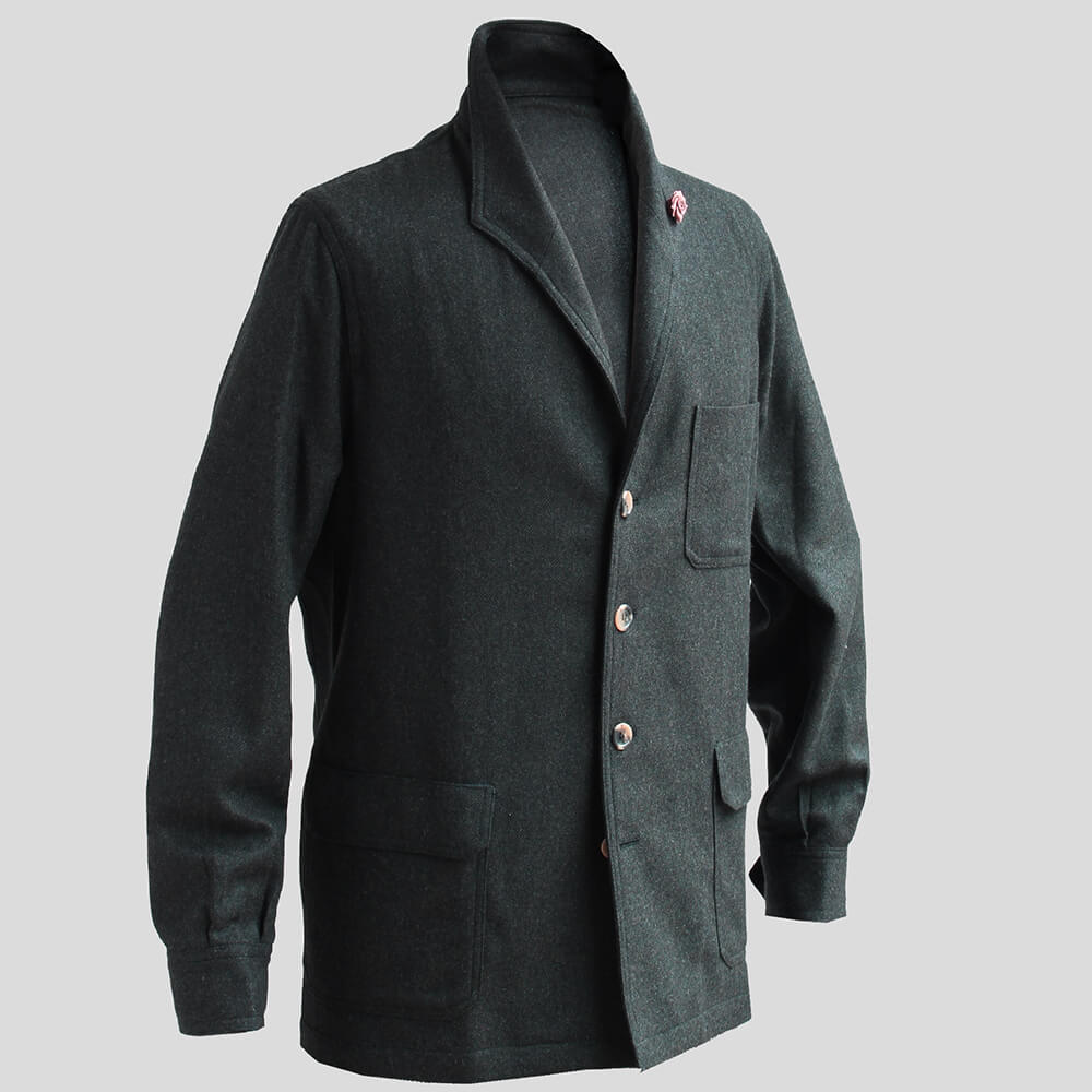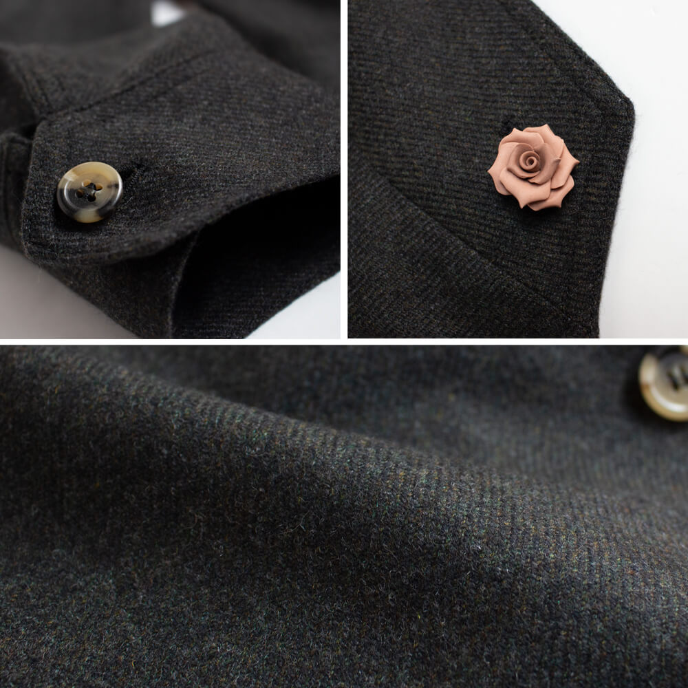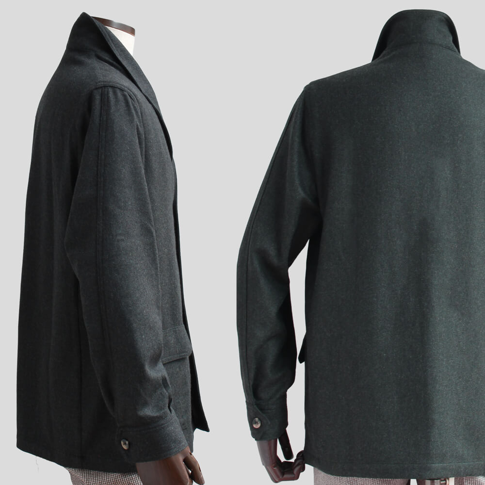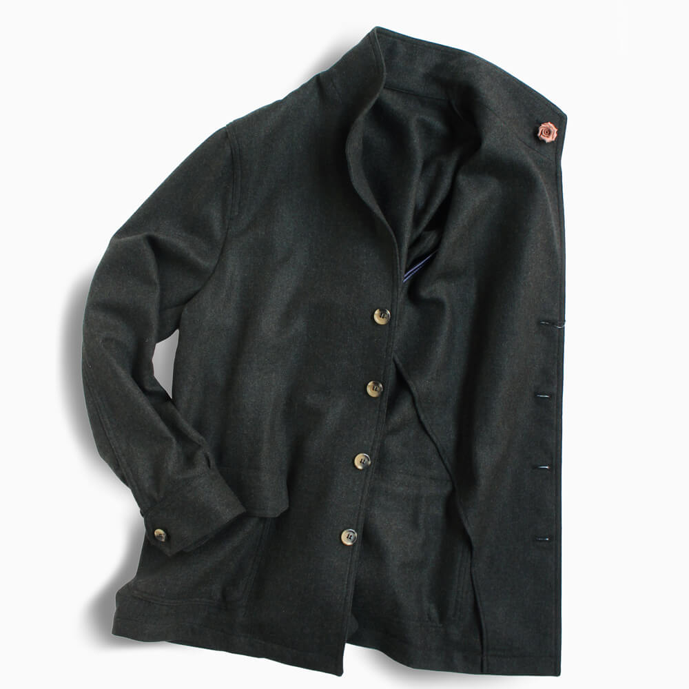 こちらのモデル『TEBA classic/テバクラシック』は、テーラードジャケットとシャツを組み合わせたようなデザインが特徴で、副資材を使用しない一枚仕立てにより軽量に仕上げられています。フロントは4つボタンでスクエアカットを採用し、フラップ付きのスクエアパッチポケットを備えています。さらに、シャツカフスや雨袖付けを施し、ノッチのないラペルとノーベントデザインなどのディテールが個性を引き立てます。