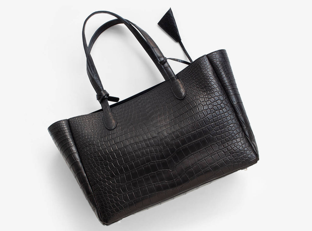 This tote bag combines presence and practicality, made with a generous amount of porosus crocodile, a material considered the highest quality in the world of exotic leathers.