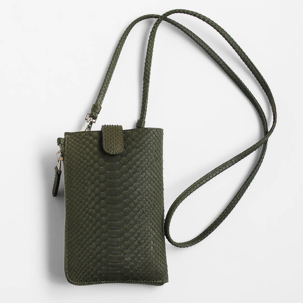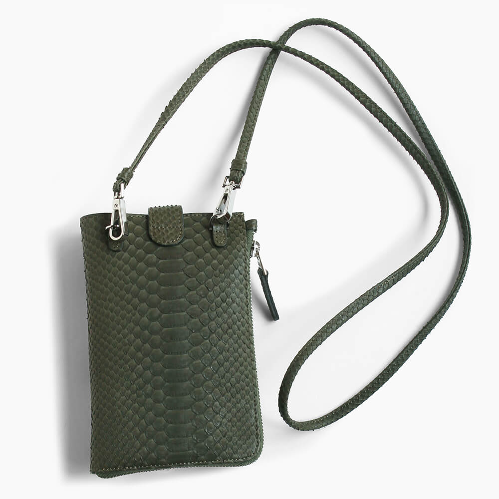 パイソンレザーは柔らかさと高い耐久性を兼ね備え、使い込むほどに味わいが増していきます。スマートフォンやミニウォレットなどがすっきり収まるサイズ感で、性別を問わず使えるシンプルなデザインが魅力です。ショルダーストラップには同素材のパイソンレザーを使用しており、取り外せばポーチとしてもお使いいただけます。